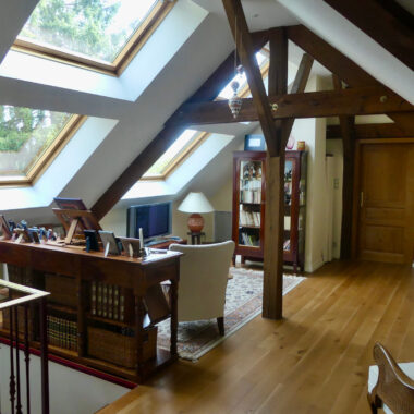L’escalier vous mène à l’étage où vous pourrez créer un espace bureau ou détente dans la mezzanine (34 m2) baignée de lumière par de grands vélux motorisés. Ce palier dessert aussi une grande chambre (26,8 m2), une salle d’eau avec WC et vous aurez également la possibilité de créer une chambre supplémentaire.