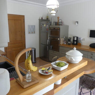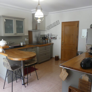 Vous accédez, de plain-pied, à une entrée (14,5 m2) qui dessert une grande pièce à vivre (56 m2) et une cuisine semi-ouverte (17 m2) entièrement aménagée et équipée.