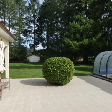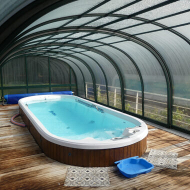 Côté extérieur vous profiterez d’une grande terrasse et d’un spa de nage (6 m) recouvert d’un dôme pour une utilisation toute l’année.