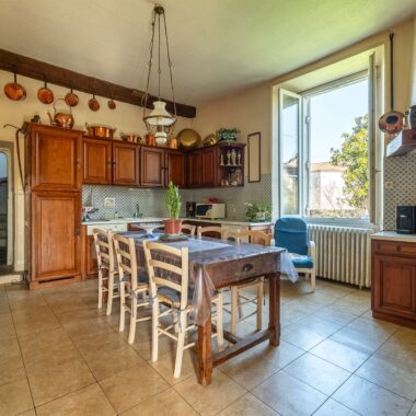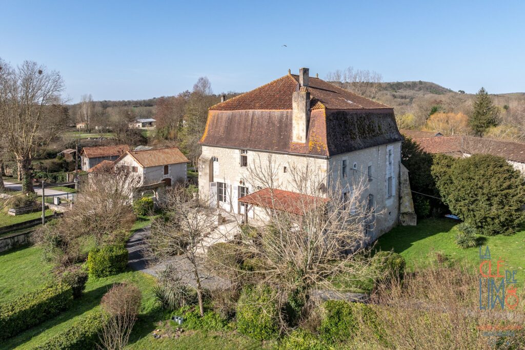 L’extérieur est composé de nombreuses essences d’arbres, de buis, de haies et un charmant mur en pierre délimite la propriété. On retrouve également une grande grange avec des garages et de nombreuses autres dépendances pour une surface totale au sol d’environ 500 m2.